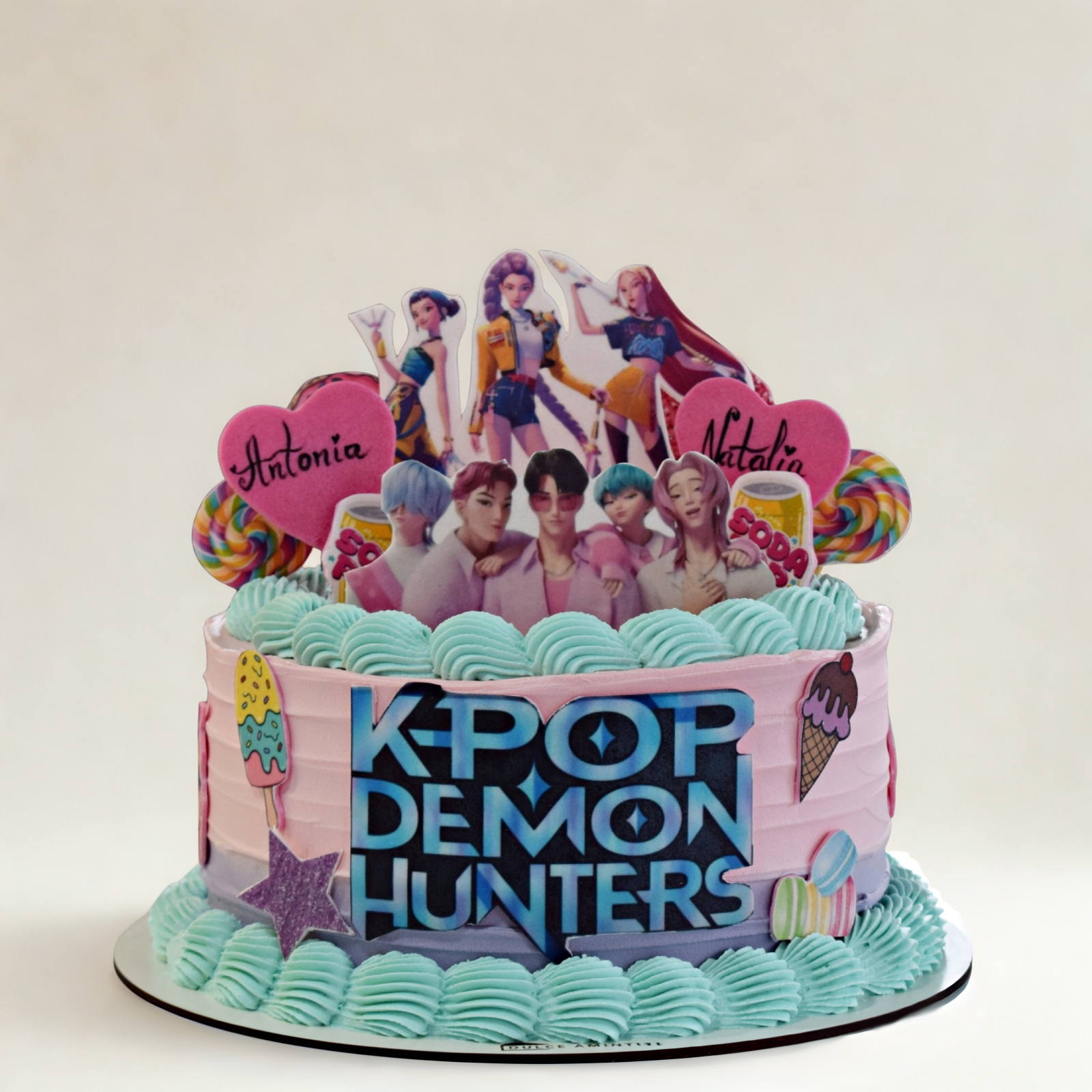 Un tort spectaculos inspirat din universul Huntrix, creat în nuanțe delicate de roz pudrat și bleu pastel – combinația perfectă pentru o petrecere plină de zâmbete și energie 🎉